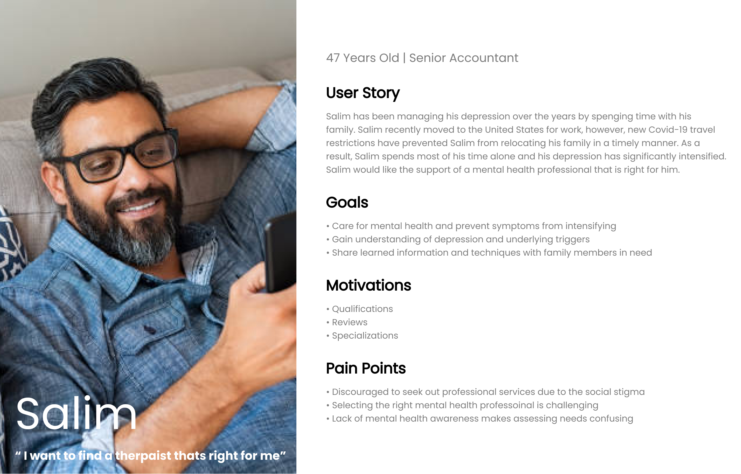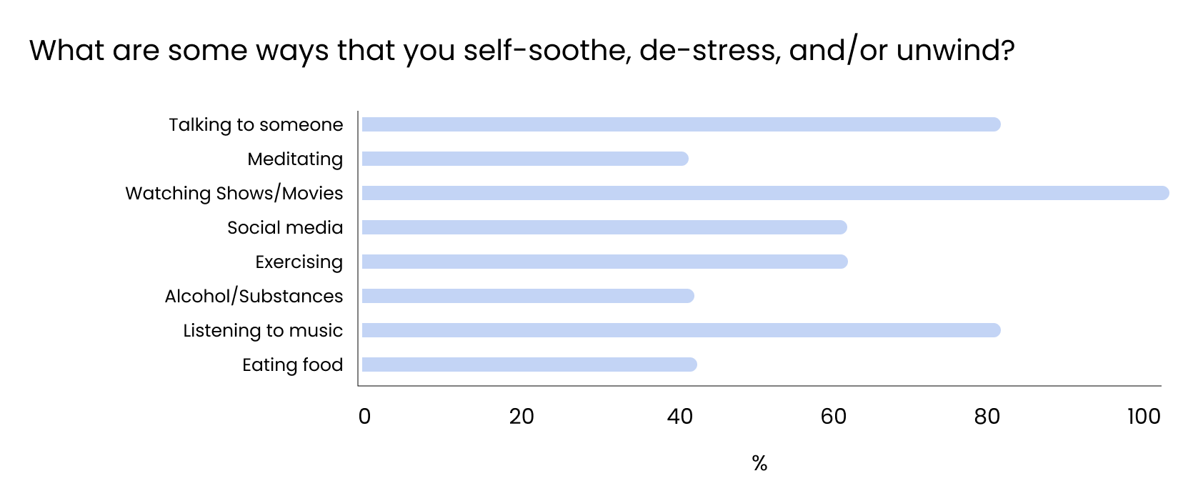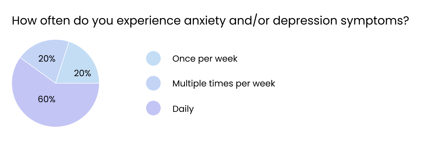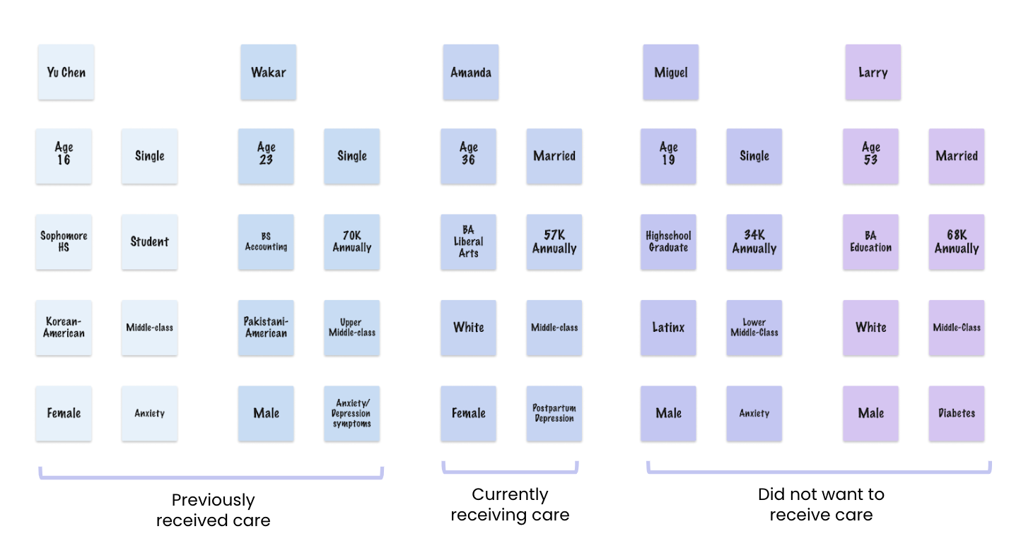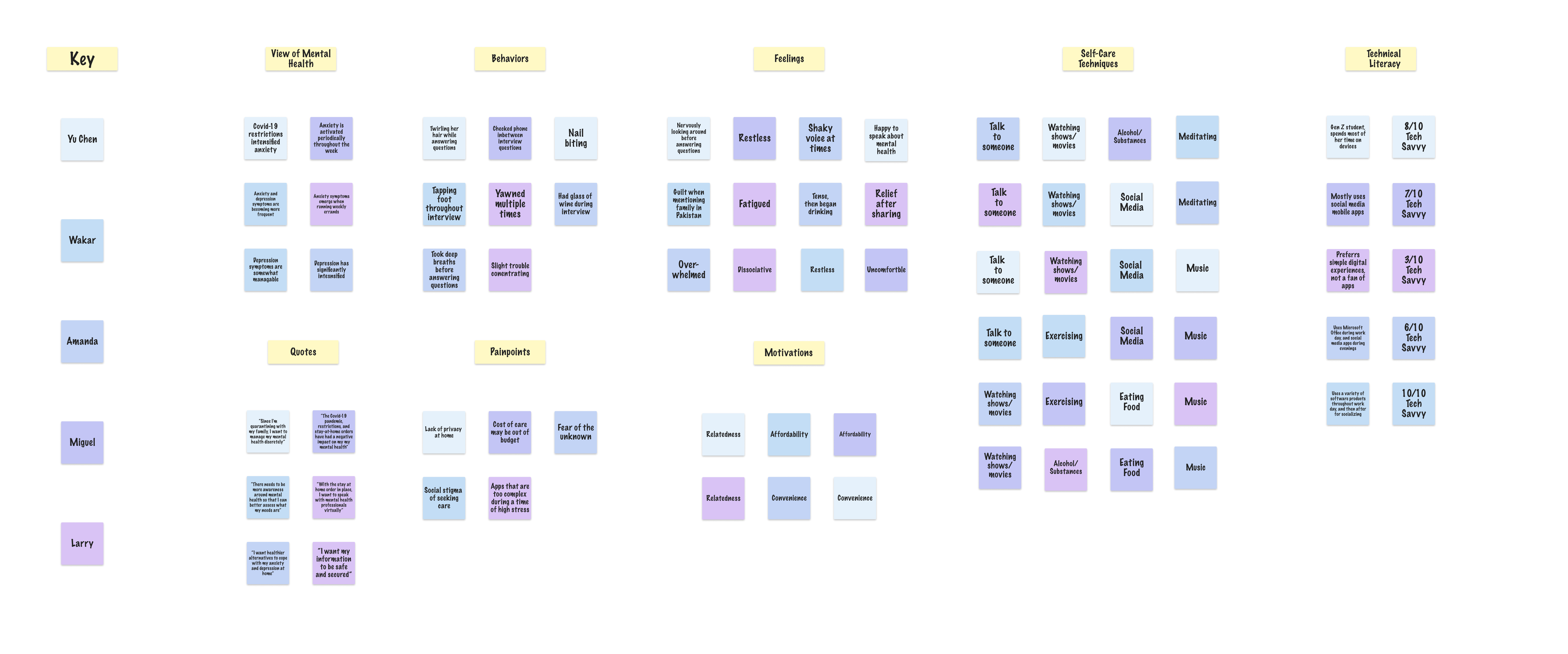 I conducted user interviews to gather observational data such as body language and other non-verbal cues in addition to the participants' responses. During the interview, I asked participants about their mental health, self-care techniques, and the barriers preventing them from seeking professional care.