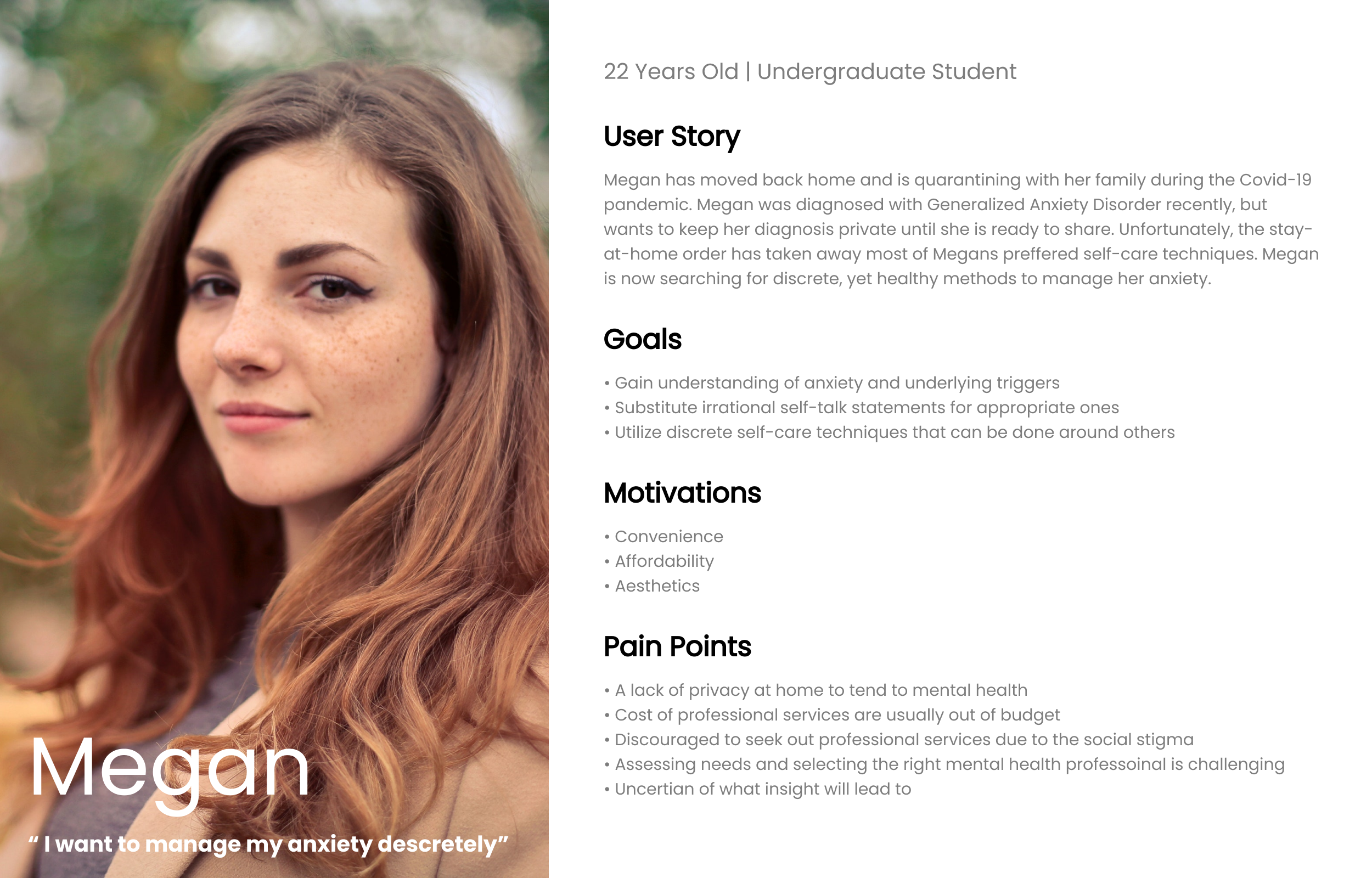 This project reinforced the importance of empathizing with users every step of the way, especially in regards to issues that are heavily stigmatized. Similar to the fluctuating regulations as a result of the COVID-19 pandemic, users needs are also likely to change. As such, including users throughout my design process was essential to creating a product with the purpose of healing.